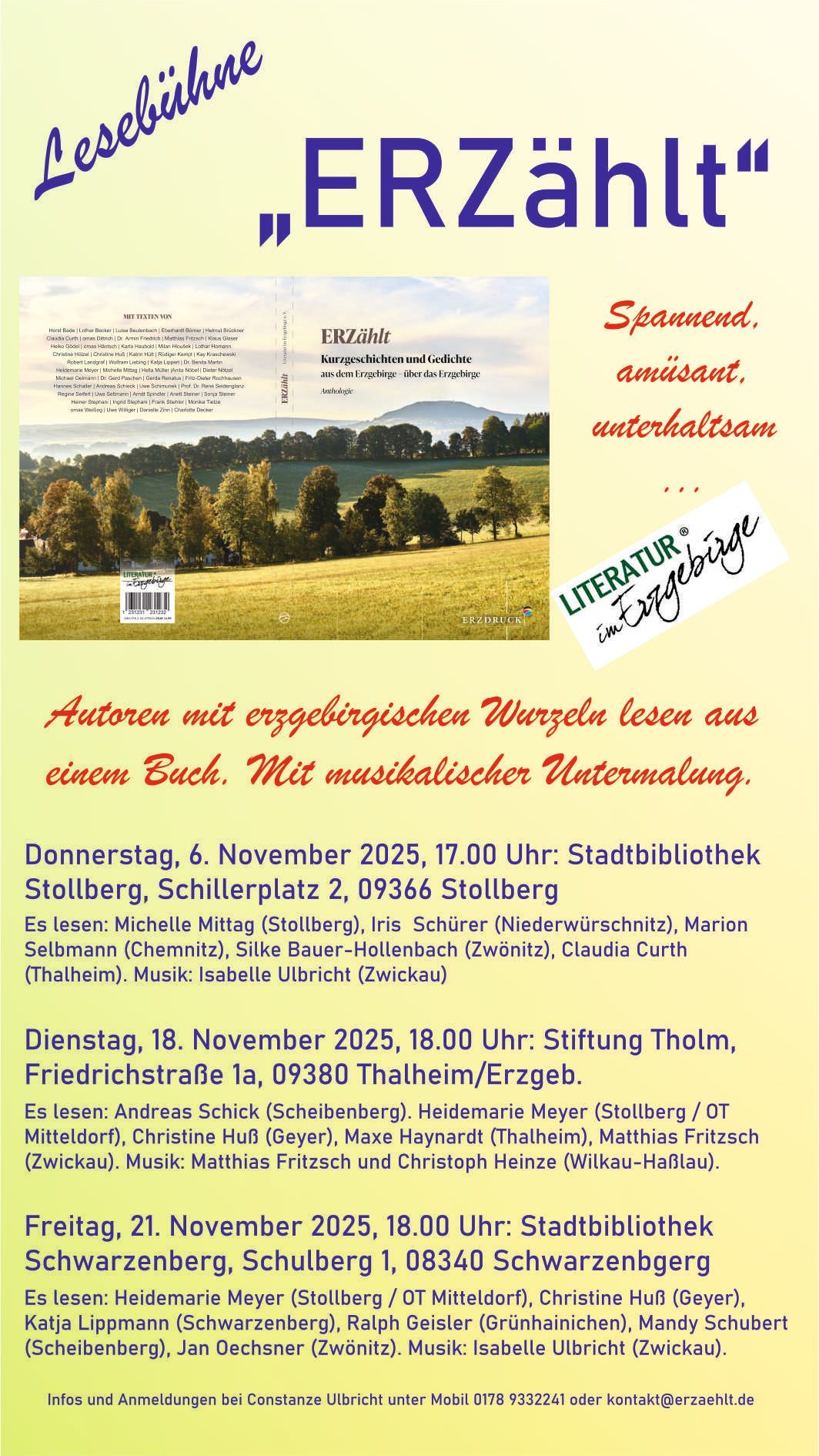 - Nächste Lesebühne "ERZählt" am Freitag, 25. April 2025, 18.00 Uhr, Kultur- und Begegnungszentrum Großrückerswalde (Marienberger Straße 72).